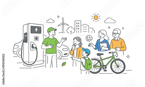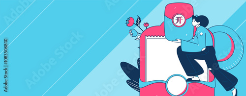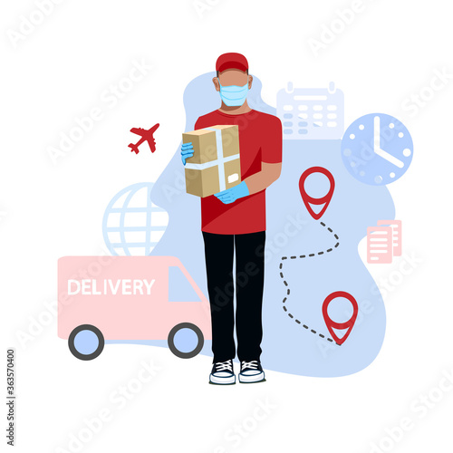 Young man courier delivering parcel to woman door by bicycle, vector flat style design illustration. Bike messenger, home delivery service concept for poster, banner etc.