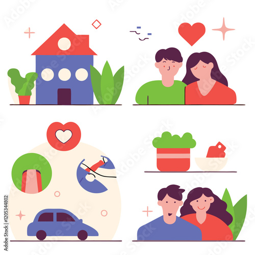 Home economics and family budget concept. Wife and husband married couple hugging portrait and money spending, increasing and savings items vector illustration
