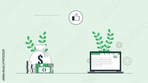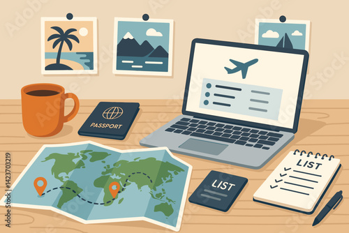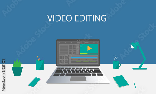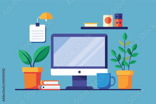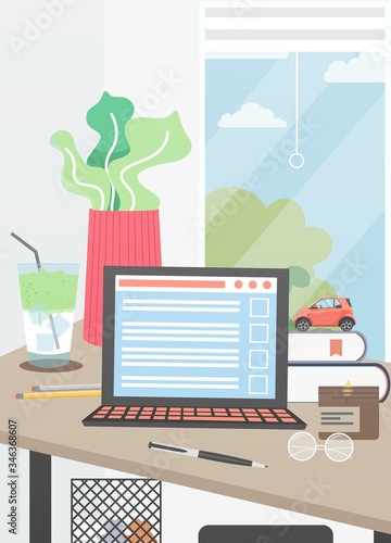 Modern home office vector poster template. Desktop with laptop computer, houseplant, books, pen, pencils, flat style design illustration. Home workspace.