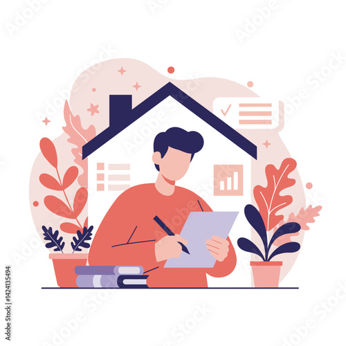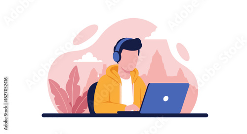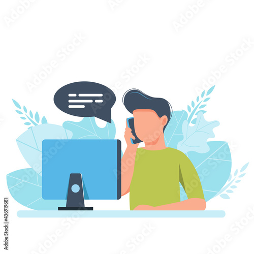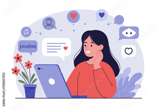 Home office vector. Young woman cartoon character working on laptop computer. Female freelancer or student having online chat flat illustration