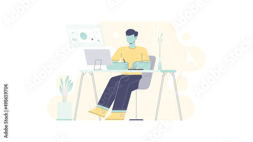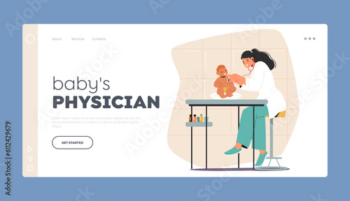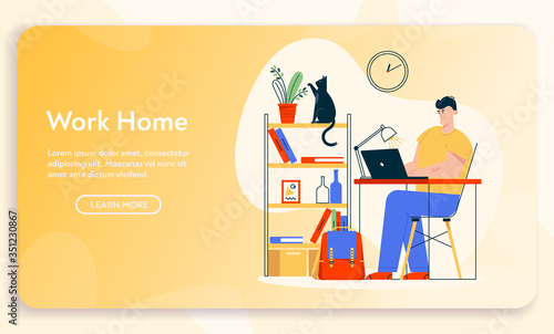 Home office vector website template, web page and landing page design for website and mobile site development. Young mom working on laptop sitting at table at home. Freelance remote work concept.