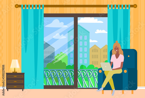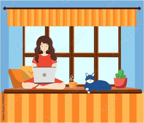 Home quarantine virus epidemic vector poster. Young girl in self isolation. Coronavirus respiratory disease prevention and awareness. Woman fell sick from corona virus and stay at home