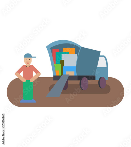 Male characters, home relocation company workers loading moving truck, vector flat style design illustration. Relocation, moving house, furniture delivery services concept.
