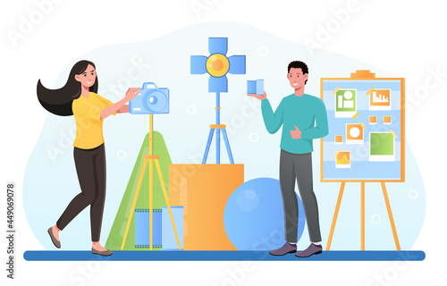 Male and female characters painting wall and installing laminate, vector illustration. Home remodeling, renovation and repair services concept for web banner, website page etc.