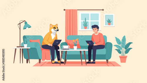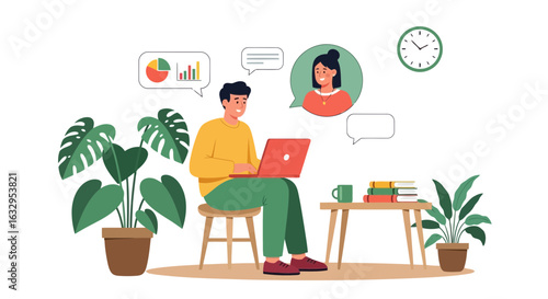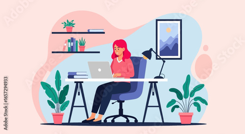 School girl watching video lesson sitting at table in front of laptop computer, vector flat illustration. Home schooling or home education. Remote distance education during coronavirus quarantine.