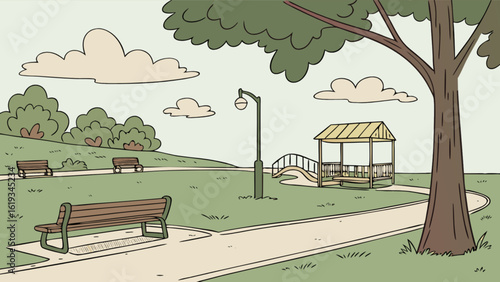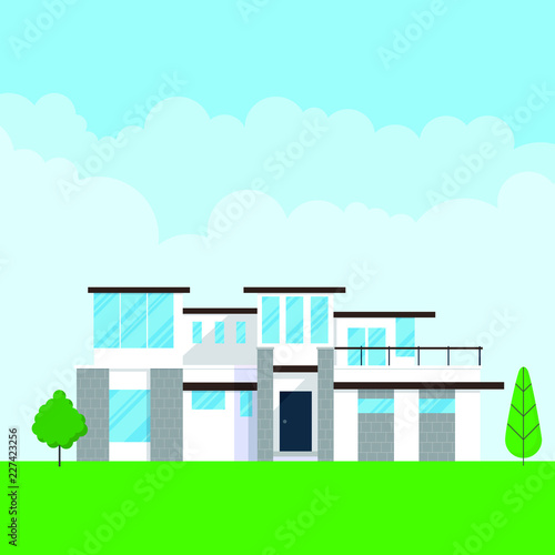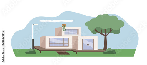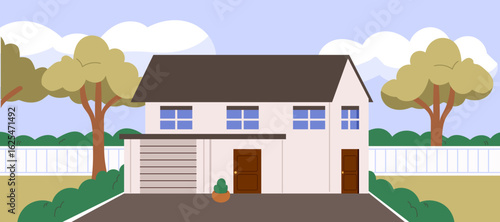 Home yard vector. House backyard illustration. Garden, fence, lawn, residential apartment and bbq equipment background