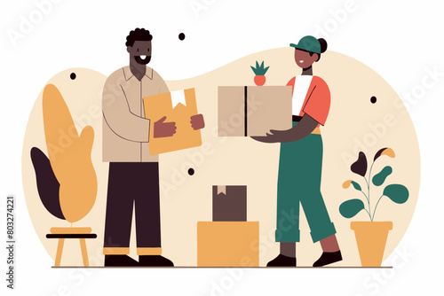 Male and female characters volunteers donating food, clothing to homeless shelters, giving free haircuts to the homeless, vector flat isolated illustration. Humanitarian aid, donation, volunteering.