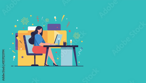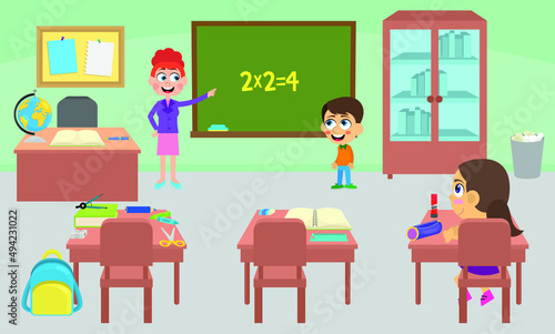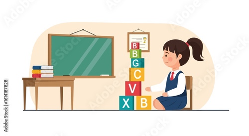 Vector illustration of happy cute girl doing homework. Flat style design.