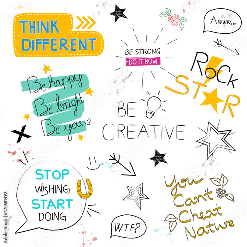 Honey set, vector flat illustration isolated on white background. Bee, beehive, honeycomb, jar and eco natural fresh floral honey hand lettering. Sweet organic food, beekeeping, apiculture concept.