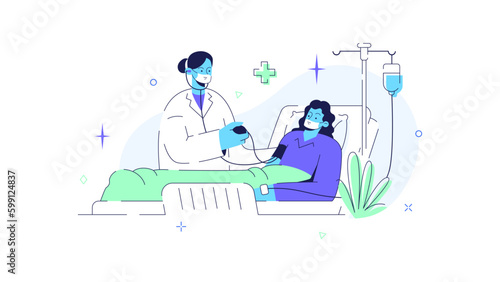 Doctors using IV fluid and ventilator to keep severely-ill coronavirus patient alive, vector flat illustration. ICU room, medical ward, hospital treatment for coronavirus respiratory disease COVID-19.