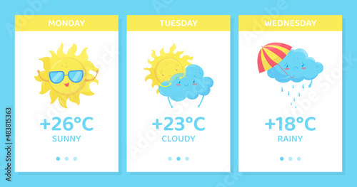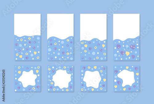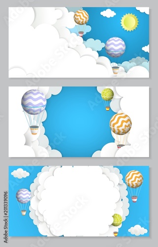 Vector vertical banner set with paper cut hot air balloons flying in the sky.