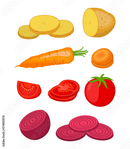 Hot dog and its ingredient set, vector illustration isolated on white background. Realistic sausage, hot dog bun, lettuce leaves, tomato, cucumber, onion, pepper slices, mustard and ketchup. Fast food