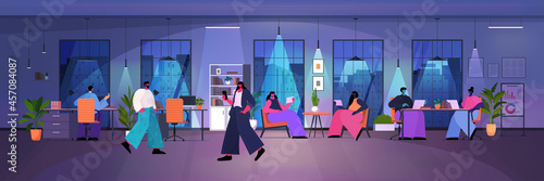 Hotel elevator, arriving and departing guests and porter with luggage trolley, flat vector illustration. Hotel customer service. Hospitality industry.