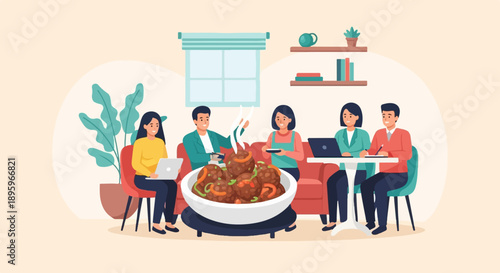 Hotel guests having breakfast in restaurant, flat vector isometric illustration. Breakfast buffet hotel services.