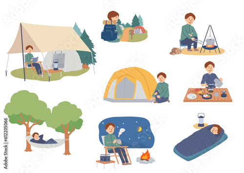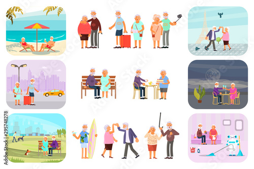 Hotel staff and services isolated vector scene. Administrator at reception counter desk, waiter in restaurant, doorman and room maid in uniform
