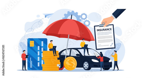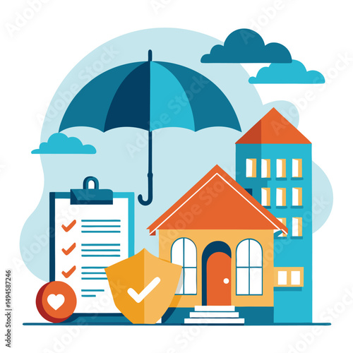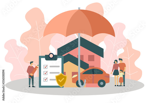 House and car under umbrella, under reliable protection of insurance policy, flat vector illustration. Property insurance services.