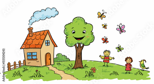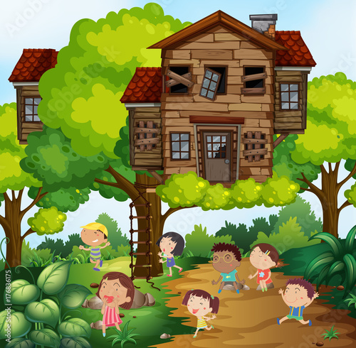 House on tree. Playground landscape. Vector children play in park with treehouse and swing. Kindergarten, school garden or outdoor summer camp
