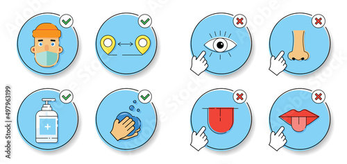 How to wear and remove face medical mask safely tips, vector infographic. Ppe, coronavirus pandemic quarantine health measures, Covid-19 disease spread prevention.
