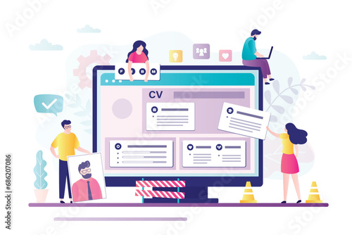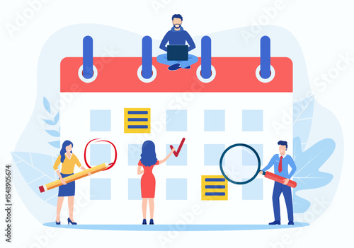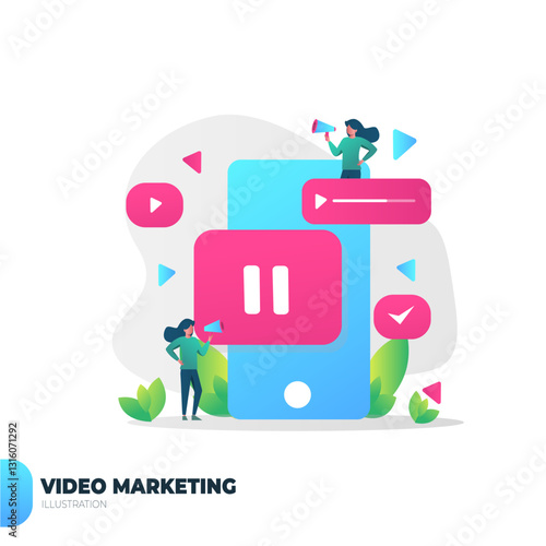 Huge tv set with film strip and video play symbol on screen, characters with popcorn, 3d glasses. Vector flat illustration. Watch tv, movie, cinema and entertainment industry, film festival concept.