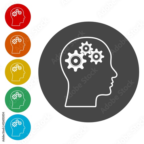 Human head and icons of science. The concept of scientific discoveries. Education and learning process. Vector illustration in linear style