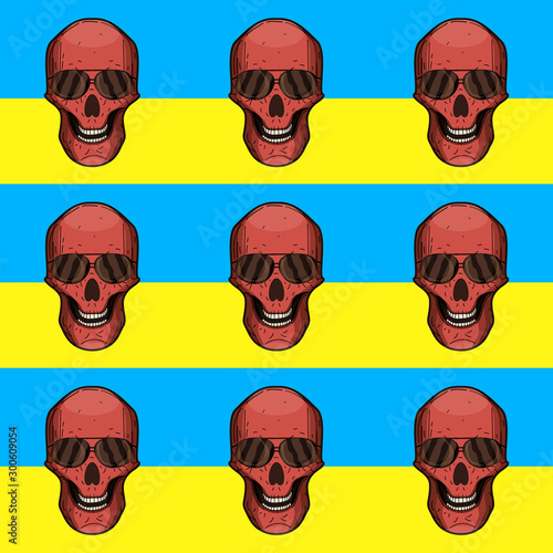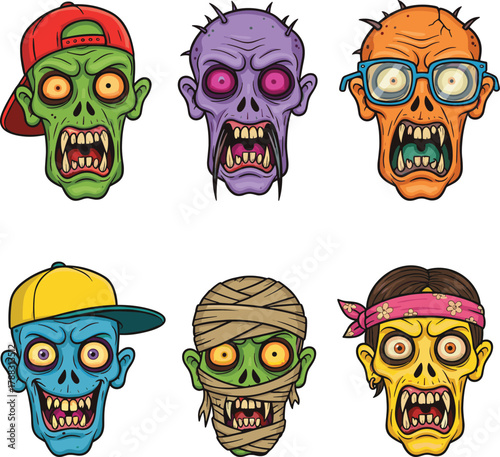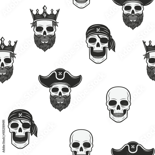 Human skull in face scarf set, vector hand drawn illustration isolated on white background. Skull with iroquois, wearing hat and cap, t-shirt graphics.