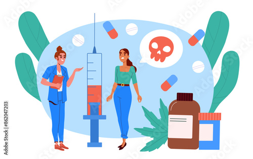 Volunteers giving donation boxes to needy people, vector flat illustratin. Medical supplies, food and clothing donation. Humanitarian aid concept for web banner, website page etc.