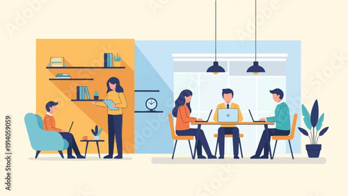 Humanitarian aid, vector flat illustration. Tiny male and female characters distributing food, medical supplies to people in need from huge cardboard boxes. Volunteering, donation, humanitarian relief
