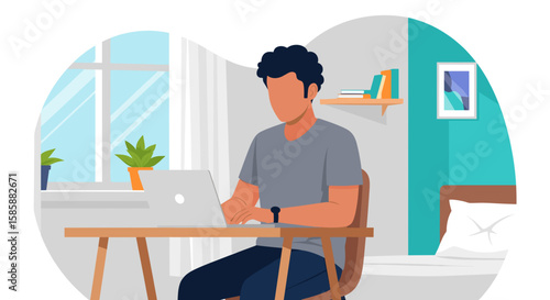 Hungry man sitting at restaurant table eating pizza, hot dog, burger, drinking soda, flat vector illustration. Fatty junk food, unhealthy eating. Overeating and obesity. Fast food addiction. Bad habit