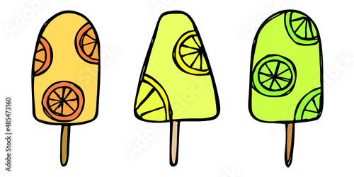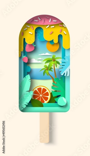 Ice cream vector. Paper cut design. Summer food, beach dessert art style. Vacation and travel symbol. Cold frozen sweet meal. Craft origami