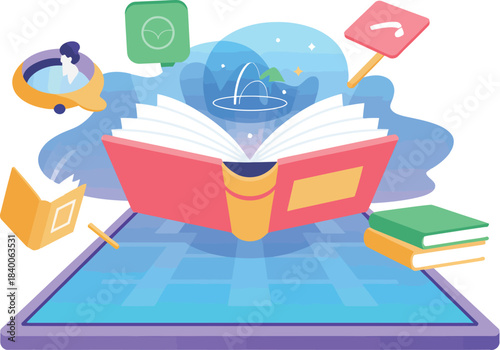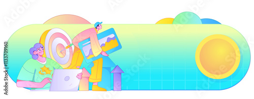 Ice cream packaging plastic bucket, tub, container mockup, paper cut sky with clouds, hot air balloons and rainbow, vector illustration. Natural healthy sweet dessert, dairy food product ads template.