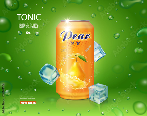 Vector realistic illustration of aluminium can with ice tea label and ice cubes, bubbles around it. Green ice tea aluminum can package mock up. Ice tea drink poster, banner, flyer design template.