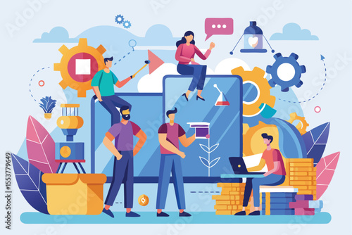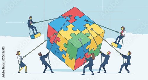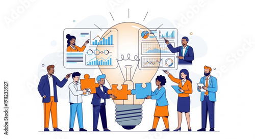Idea creation, vector flat style design illustration. Tiny business people team putting big light bulb puzzle pieces together. Brainstorming, teamwork, business innovation concept for web banner etc.