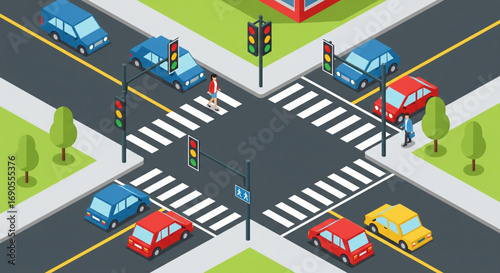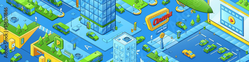 Illegal parking isometric scene. Traffic policeman writing a parking ticket to car in no parking area and tow away no parking sign vector illustration