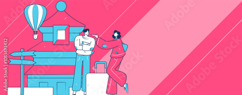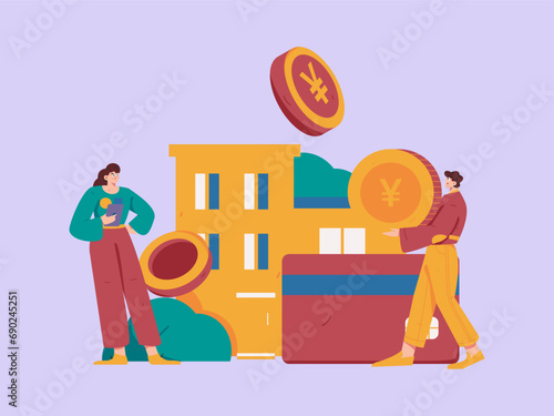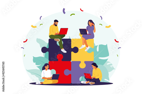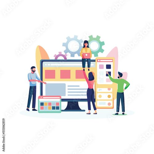 Vector illustration of industrial robotic arm picking up parcel from conveyor belt and placing it in new location, workers. Factory automation, pick and place robots concepts for web banner, webpage.