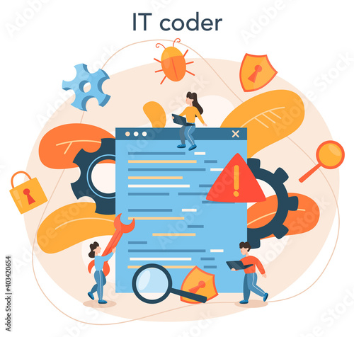 Vector illustration of industrial robotic arm picking up cardboard box from conveyor belt and factory workers engaged in their work. Robotic pick and place automation concept for web banner, webpage.