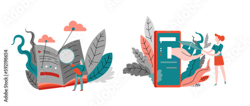 Coffee quotes hand lettering typography with happy couples enjoying latte, cappuccino or black coffee, vector flat illustration isolated on white background. Morning coffee inspirational sayings.