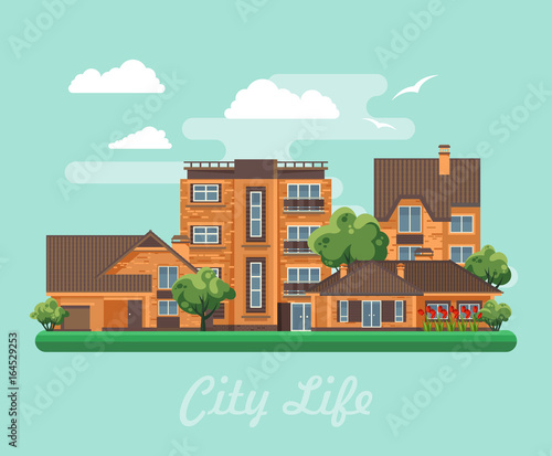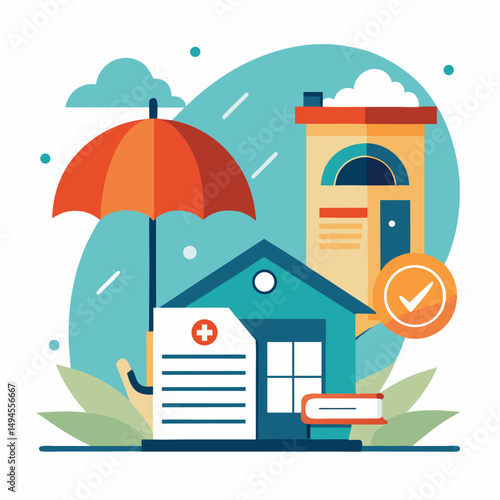 Insurance concept vector flat style design illustration. House under umbrella, globe, money, contract, lifebuoy, hand holding shield. House insurance poster, banner.