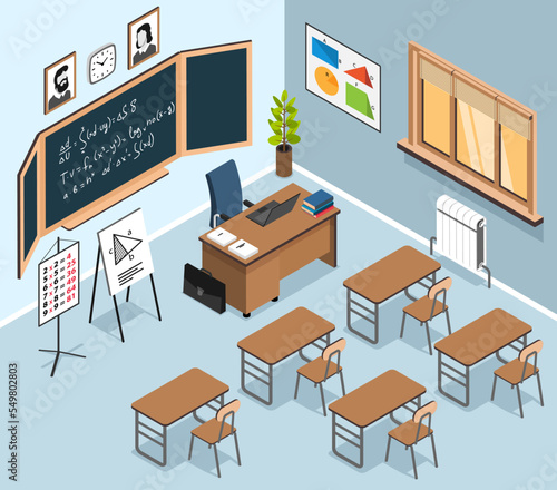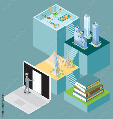 Interior design service. Kitchen room furniture 3d models on computer screen, house blueprint, flat vector isometric illustration. Online interior planning.