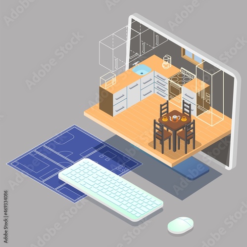 Interior design service. Living room furniture 3d models on computer screen, house blueprint, flat vector isometric illustration. Online interior planning.