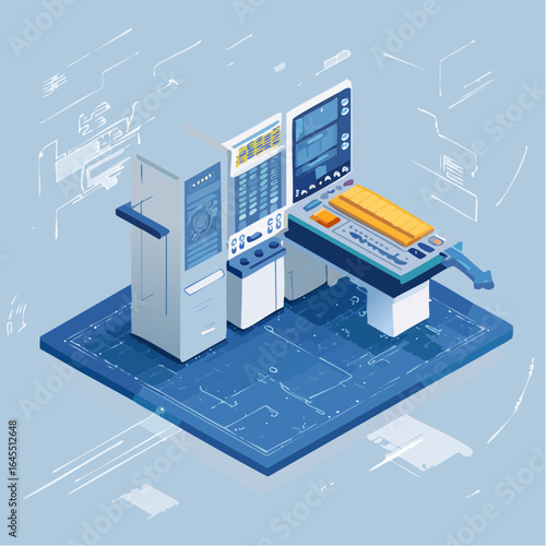 Interior design service. Living room furniture 3d models on computer screen, house blueprint, flat vector isometric illustration. Online interior planning.