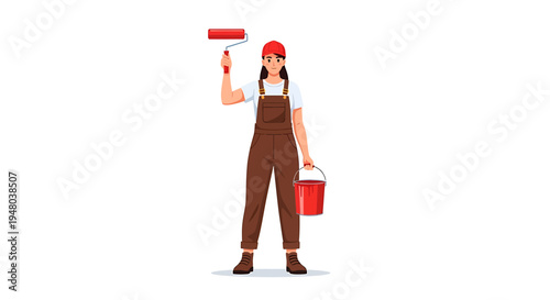 Woman professional interior designer with paint bottle and paintbrush, vector flat illustration isolated on white background. Home apartment repair remodeling renovation services.