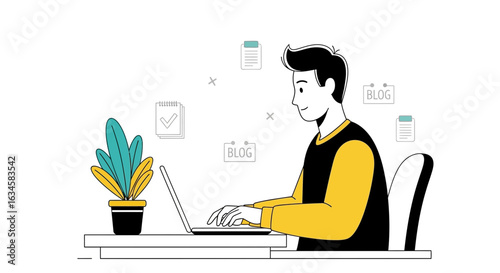 Vector illustration of office worker male sitting at the table, using computer and surfing the net while drinking tea. Internet people flat style design element, icon isolated on white background.