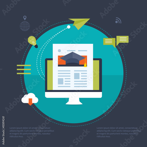 Investment in education concept vector flat illustration. Laptop ebook globe academic graduation cap, human brain, dollar coins. Business investing in human capital development poster, banner.