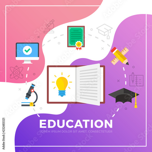 Investment in education concept vector flat illustration. Computer, academic graduation cap, hourglass, desk lamp, stationery, hand holding dollar coin. Investing in company staff education poster.