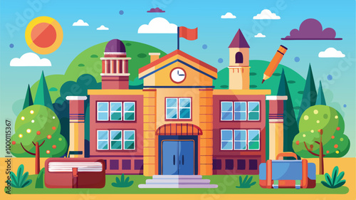 Investment in education concept vector illustration with school building, gold coins, books, school supplies, graduate cap and award cup. Flat style design element for poster, banner, print.