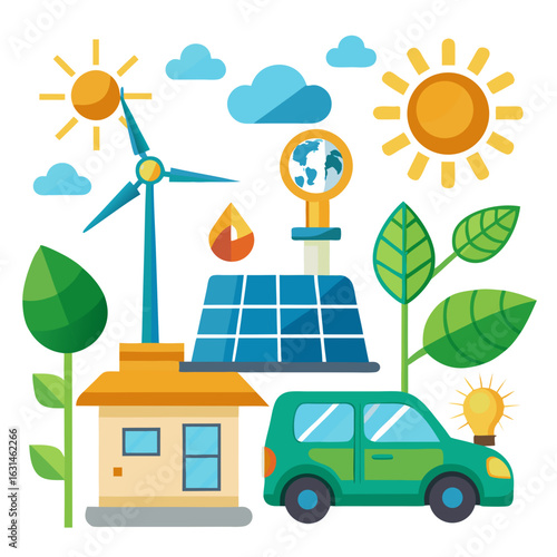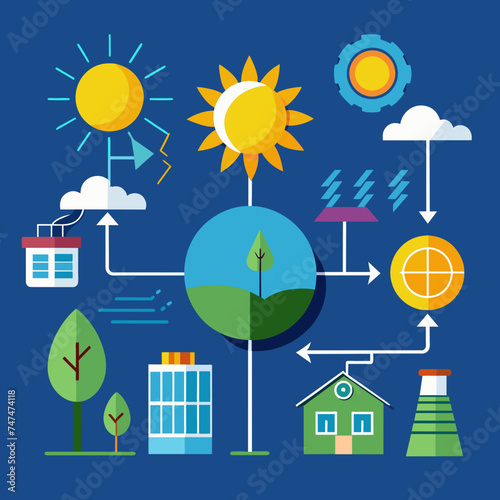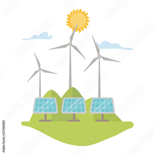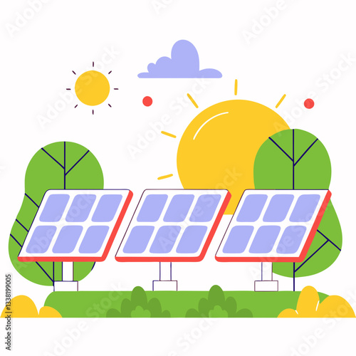 Investment in solar renewable energy concept vector illustration. Green city with wind mills, solar panel and dollar coins. Flat style design element for website template, poster, banner etc.