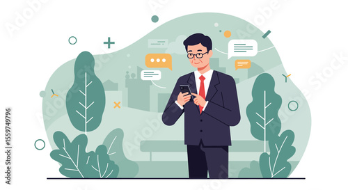 Vector illustration of confident businessman holding money in one hand and briefcase full of money in another hand. Investor flat style design element.