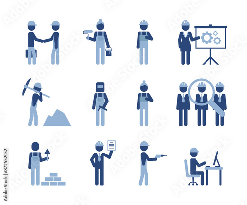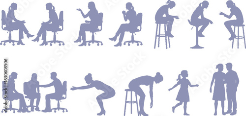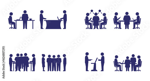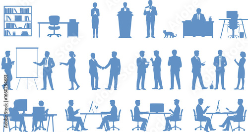 Isolated set of business people working in office, presenting speech on conference, negotiating, brainstorming, searching idea, handshaking vector illustration on white background
