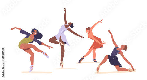 Isolated set of male and female ballet dancers wearing pointe shoes performing and practicing classic dance movement. Man and woman exercising alone or in pair vector illustration