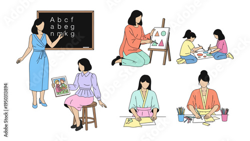 Isolated set of patient and dentist characters. Man holding tooth x-ray, little boy on checkup, orthodontist with dental tools and examination results vector illustration